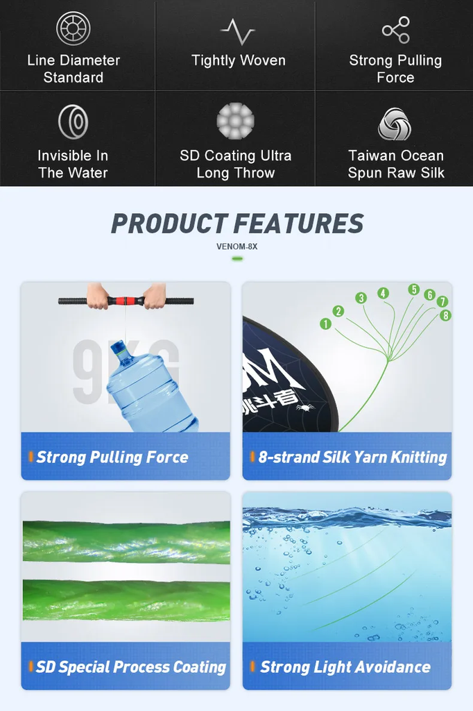 Nguyên Liệu Lụa Thô Từ Đài Loan: PE X8 Venom được làm từ nguyên liệu lụa thô chất lượng cao có nguồn gốc từ Đài Loan. Nguồn nguyên liệu này nổi tiếng về độ bền, độ mịn và sự ổn định, đóng góp đáng kể vào chất lượng tổng thể và hiệu suất vượt trội của dây.